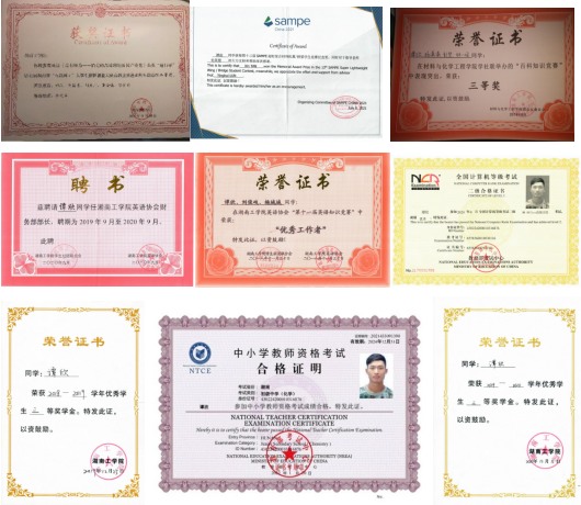 在校期间获得优秀学生干部、三好学生、三好学生标兵、一等奖学金、国家励志奖学金。顺利通过英语四六级,参与专业网课建设,《复合材料力学——从基础到应用》目前已超过6000人参与学习。曾担任材化学院创新创业孵化基地项目负责人、第十三届SAMPE超轻机翼/复合材料桥梁设计大赛队长、获得衡阳市优秀志愿者、职业生涯规划大赛三等奖、优秀运动员、社团活动积极分子、优秀部长等。